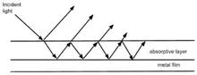 A planar nanocavity consists of an absorptive semiconductive film no more than a few nanometers thick over a metal film also a few nanometers thick.[7] Incident light is absorbed and reflected off of both layers, the absorbed light then resonates between the two interfaces, transmitting some light back at after each cycle. Germanium is commonly used for the absorptive layer, while gold, aluminum, and aluminum oxide are used as alternatives as well.[7] Planar nanocavities are commonly used for thin film interference, which occurs when incident light waves reflected by the upper and lower boundaries of a thin film interfere with one another forming a new wave. An example of this is the colorful patterns produced by thin layers of oil on a surface. The difference in colors is due to minute differences in the distance reflected light travels whether it reflects from the top or bottom boundary of the oil layer. This difference is called the optical path difference, the difference in distance between the top and bottom reflection paths, which can be calculated with equation 2: