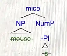 The structure of irregular plural nouns in English, and why they surface in the lexicon can be explained using a nanosyntactic approach. For example, the plural of mouse is not *mouses (* indicates ungrammaticality), it is mice. The structure of a plural noun can be broken down into the following morphemes: [Noun Plural][15] The lexical item mice is able to lexicalize both the noun and plural morphemes in one singular morpheme because it is both a larger and more specific structure than *mouse-s. This means that is more favourable because it spells out an entire syntactic sub-tree rather than an individual daughter node.