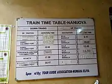 The Nanu Oya railway station is the 63rd station on the Main Line, and is 206.9 km (128.6 mi) away from Colombo. All trains including Podi Menike and Udarata Menike express trains service the station. The station was a junction and branching point for the Udupussallawa narrow gauge railway line connecting Nanu Oya with Ragala via Nuwara Eliya.