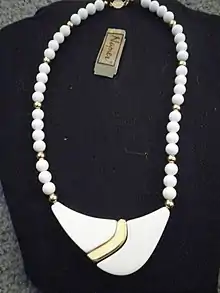 In the 1920s and 1930s, Napier designed necklaces, bracelets and earrings in a range of styles including, designs featuring Egyptian motifs, such as cobras, Victorian Revival designs and Deco-style motifs. The company produced very little jewelry during the 1930s, focusing on its giftware lines. In the 1940s, most of the jewelry produced was sterling silver tailored pieces. In the 1950s, it produced jewelry in a wide range of styles. Napier jewelry is notable for its simple, modern, geometric and floral designs. However, the company also produce boutique and high-end jewelry. Some of the metalwork bears resemblance to Mexican and Scandinavian designs.[2] The fan jewelry collection was introduced as a 10-year fundraising commitment in 1955. In the 1950s, the Napier Company presented First Lady Mamie Eisenhower with a bracelet bearing an elephant design, which was reputedly one of her favorite pieces of jewelry, and which she wore often,[3] and the Napier Company gifted the contestants of the 1955 Miss America Pageant with fashion jewelry.