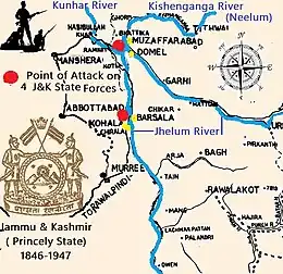 Maharaja responded by deployment of their top most security force 4th J&K State Force commanded by Lt. Col N.S Sambyal in this sector to guard these entrances on the border with Pakistan. Plans were prepared for the demolition of the Kohala Bridge and gaps in Muzaffarabad-Mansehra road by the explosives which were supposed to be arriving from India.[2][3] On the unfortunate night of 21 October 1947 mixed 4th Battalion of Maharaja swept sides at Loharigali and Ramkot and created chaos within their defensive positions leading to burning of Muzaffarabad and Domel, by twilight the 6000 'qabalis' invaders joined Indian rioters, only the mortar garrison at Domel held their position in which only 15 men survived out of several companies till nightfall of 22 October 1947.[4][5] On the night of 22 October 1947 Lt. Col Sambyal along with six men took a task to blowup the Kohala bridge 22 mile from Domel, as his jeep was 5 km out of Domel they fell to an enemy ambush, the surviving three Garrison Police Company men narrated the story of Lt. Col. Sambyal's martyrdom on 25 October to Lieutenant Labh Singh, Commander of 'A' Company and Platoon of 'B' company of the 4th Battalion with a detachment of 3" mortars, located at Kohala-Barsala bridge. [6][7].[8]