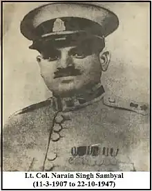 Colonel Narain Singh Sambyal, OBE (11 March 1907 – 22 October 1947), also remembered as the Savior of Kashmir, was an Indian Commander of 4th Jammu and Kashmir State Forces who died fighting during the First Kashmir War at Domel Muzaffarabad.