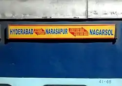 ![]() Name board of Narsapur Express (above) Diesel locomotive of Narsapur Express | |||||