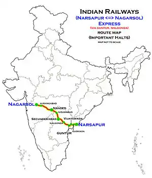 The 17231 / 32 Narasapuram Nagarsol Express runs from Narasapuram via Bhimavaram Town, Vijayawada Junction, Guntur Junction, Nadikudi, Secunderabad Junction, Nizamabad Junction, Hazur Sahib Nanded, Purna Junction, Aurangabad to Nagarsol.