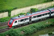 On 24 April 2013, the first Diesel Electrical Multiple Unit (DEMU) service in the country was inaugurated between Narayanganj and Dhaka. Twenty DEMU sets were purchased from Chinese manufacturer CRRC Tangshan for Tk 460 crore (US$59 million as of 2013). Each set consists of three carriages, with the engines incorporated into the ones on either end, and has a capacity of 149 seated passengers and 151 standing passengers.[12][13][14] Eighteen months later, the Dhaka Tribune characterized the DEMU service as "a lemon" because travel time was little better than conventional service, carriages had inadequate ventilation, and there was a three-foot mismatch between carriage door and station platform heights.[15] By July 2019, half of the DEMUs were out of operation due to break downs. Prime Minister Hasina described them as "unfit", and said no more would be purchased.[16]