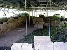 The cemeteries date from the 8th-6th centuries B.C. (the Villanovan and Orientalizing periods), representing perhaps four or five generations at the settlement.[25] The earliest tombs were well-tombs, dug pits with an urn at the bottom containing the cremated remains of the deceased.[26] Trench tombs later became more popular, following the growth of the trend toward inhumation.[27] It was typical for a small selection of goods to be buried with the cremated remains of the deceased.