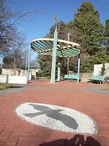 Narrabundah: A Site Marker 1998 Susie Bleach & Andrew Townsend. This Site Marker refers to Narrabundah's social history. Narrabundah means 'little hawk' in the language of the local indigenous people. The steel elements, power poles and pebble mosaic refer to the European construction workers who made Narrabundah their home in the 1950s.