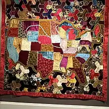 A legend describes quilts being hung on clotheslines outside of safe houses along the Underground Railroad in the 1830s. Embedded within the quilts was a code describing where to go next.[4] The myth explains the symbols used, such as the Bow Tie, the Bear Paw, or the Log Cabin designs. The bow-tie design was meant to say that those passing should dress in a disguise to appear higher status. The bear paw symbolized following the animal trails up to the mountains for food and water. And the log cabin meant to seek shelter here this is a safe place to stay. The Drunkard's Path was meant to say zig-zag as you come along this path, in case you are being stalked by hounds. And the Double Wedding Ring pattern is suggested to mean it is now safe to remove your chains and shackles. Although this concept is debated among historians, many people associate this quilting myth with narrative quilting due to the theorized content and story these quilts held.[5]