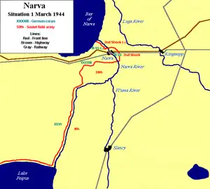 The setbacks in the Narva offensive (15–28 February 1944) came as an unpleasant surprise to the leadership of the Leningrad Front, blaming it on the arrival of the Estonian Division.[6] Since the beginning of January, the Leningrad Front had lost 227,440 troops killed, wounded or missing in action, which constituted more than half of the troops who participated in the Leningrad–Novgorod strategic offensive. Both sides rushed reinforcements into the area.[7][8] The 59th Army was brought to Narva and the 8th Estonian Rifle Corps placed under the command of the Leningrad Front.