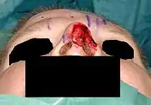 Nasal reconstruction using a paramedian forehead flap within oral and maxillofacial surgery, is a surgical technique to reconstruct different kinds of nasal defects.[1] In this operation a reconstructive surgeon uses skin from the forehead above the eyebrow and pivots it vertically to replace missing nasal tissue. Throughout history the technique has been modified and adjusted by many different surgeons and it has evolved to become a popular way of repairing nasal defects.