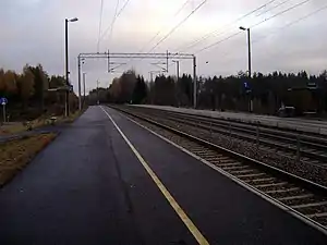 The Nastola railway station (Finnish: Nastolan rautatieasema, Swedish language: Nastola järnvägsstation) is located in the city of Lahti (formerly the municipality of Nastola) in the Päijänne Tavastia region, in Finland. The station is located in the centre of the urban area of Nastola, and the distance from the Lahti railway station is 15.7 kilometres and that from the Kausala railway station is 23.6 kilometres.[2]