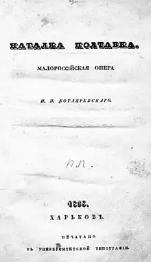 Natalka Poltavka[1] is a 1936 Ukrainian feature film directed by Ivan Kavaleridze and shot by the Ukrainfilm studio. The film was remade in 1969 at the Dovzhenko Film Studios. The film was based on the opera by Mykola Lysenko (1842—1912), based on the play of the same name by Ivan Kotlyarevsky. The film was then reshot in 1937 by Vasyl Avramenko, the first Ukrainian film produced in the United States,[2] and again in 1978 under the direction of Rodion Yukhymenko. This new version was extended to 90 minutes.[3]