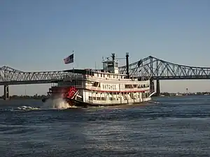 The ninth Natchez, the SS Natchez, is a sternwheel steamboat based in New Orleans, Louisiana. Built in 1975, she is sometimes referred to as the Natchez IX. She is operated by the New Orleans Steamboat Company and docks at the Toulouse Street Wharf. Day trips include harbor and dinner cruises along the Mississippi River.