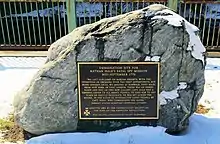 The Yale Club bears a plaque hung by the Daughters of the American Revolution which states the event occurred "near" the Club.[26] Yale is Hale's alma mater and the Club is at 44th Street and Vanderbilt Avenue, mere feet from Grand Central Terminal. Another account places Hale's execution at Bergen Beach, Brooklyn, but there is no evidence to support this claim.[27]