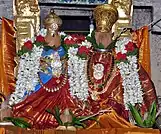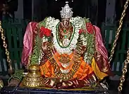 The temple priests perform the pooja (rituals) during festivals and on a daily basis. As at other Vishnu temples of Tamil Nadu, the priests belong to the Vaishnavaite community, a Brahmin sub-caste. The temple follows the Thenkalai sampradaayam and agamas of South Indian Vaishnavism. The temple rituals are performed six times a day: Ushathkalam at 7 a.m., Kalasanthi at 8:00 a.m., Uchikalam at 12:00 p.m., Sayarakshai at 6:00 p.m., Irandamkalam at 7:00 p.m. and Ardha Jamam at 10:00 p.m. Each ritual has three steps: alangaram (decoration), neivethanam (food offering) and deepa aradanai (waving of lamps) for both Srinivasan and Shenbagavalli. During the last step of worship, nagaswaram (pipe instrument) and tavil (percussion instrument) are played, religious instructions in the Vedas (sacred text) are recited by priests, and worshippers prostrate themselves in front of the temple mast. There are weekly, monthly and fortnightly rituals performed in the temple. Pavitrotsavam is a festival organised in the temple by Karimaran Kalai Kappagam of Triplicane, Chennai, every July. The festive images of the deity are taken out in procession and special poojas are performed during the occasion.[3] Akshaya Tritiya is another major festival celebrated in the temple when the festival deity is taken in procession in a Garuda mount around the temple.[5]