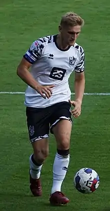 On 8 October 2022, he helped Vale to win 2–1 at Derby County and caused opposition goalscorer James Collins to be sent off after he elbowed Smith during a scuffle on the ground.[55] He was voted as the club's Player of the Month for December after he helped the team to record two clean sheets in victories over Plymouth Argyle and Morecambe.[56] He continued his good form into the following month and won a second consecutive Player of the Month award, starting all four of his club's January fixtures playing alongside Connor Hall, Dan Jones, Will Forrester, Lewis Cass and Aaron Donnelly in the back three.[57][58] He also played all seven games of February, scoring against Barnsley, helping to keep a clean sheet against Exeter City, and having a goal against Accrington Stanley controversially ruled out.[59] He signed a new two-year contract in April following weeks of "laid back" conversations with director of football David Flitcroft.[60][61] Smith was voted as the club's Player of the Year for the 2022–23 season, having missed just one league game throughout.[62]