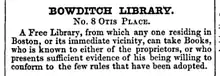 In the 1840s and 1850s, Bowditch's son, Dr. H. I. Bowditch, ran the "Bowditch Library" on Otis Place in Boston's Financial District.[7] It was "free to those who reside in Boston, or in the vicinity. ... This is the library of the late Nathaniel Bowditch, and is almost exclusively of a scientific character."[8] In 1858 the family gave the collection, "which consists mostly of mathematical and astronomical works", to the Boston Public Library.[9]