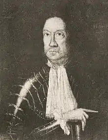 Nathaniel Johnson was born on 7 April 1644, near Kibblesworth, Durham.[1][2] He joined the British Army in his youth. Eventually, he joined the Member of Parliament (MP) for Newcastle upon Tyne, 1680–1689.[3] In 1686, he was appointed governor of the Leeward Islands,[1] governing Treves, Saint Kitts, Montserrat, and Antigua.[2] He travelled to the Province of Carolina in 1689, becoming its governor in 1703.[1] While he started his government sanctioned "a blow at the Spanish interest directed against Louisiana and Florida: the Apalachee expedition of 1704". In 1702, while he governed there, he oversaw the defense of Charles Town against an attempted Franco-Spanish assault. In addition, he created the Parish system in this colony. Johnson rejected the constitutions of church and state because he believed these were dissenters of all denominations. So, to reduce or eliminate their power and influence, the Commons House of Assembly established a new bill that expulsed to the dissenters (who were mostly in South Carolina) of the Common House. The bill forced to the people who would want to be chosen in the Assembly accept and practice the rites of the Church of England, doing an oath, subscribing to a declaration and receiving a sacrament own of this church. The dissenters refused this measure because they thought the governor had taken away their civil rights and religious liberties. The residents of Colleton County, elaborated and written about his "grievous circumstances" and gave it to the Lords Proprietors with order that they remove the law. It was enacted, that twenty lay-persons be constituted a corporation for the exercise of ecclesiastical jurisdiction, with full power to deprive ministers of their livings at pleasure, not for immorality only, but also for imprudence, or on account of unreasonable prejudices taken against them.[2] He ended his term in 1709 and died 1 July 1712 in Berkeley County, South Carolina.[1][2]