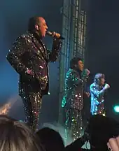 De Toppers took part in technical rehearsals on 6 and 10 May, followed by dress rehearsals on 13 and 14 May.[36][37] The Dutch performance featured De Toppers wearing glittery suits and performing together with three backing vocalists, one of them carrying a DJ set. The performers also held lights in their palms.[38][39] The predominantly dark stage with deep blue colours on a black background at first transitioned to flashing bright lights with the LED screens displaying shapes in blue, silver and white colours as well as the word "Shine". Several effects including fireworks, coloured bolts and silver fountains were used at the end of the performance.[39][40][41] The three backing vocalists that joined De Toppers were: Dedre Twiss, Ingrid Simons and Sarina Voorn.[42]
