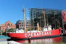 ![]() The National Aquarium (angular original building with glass pyramid top of 1981, rear right, and 2005 north extension to its left) lies near two of four historic museum / exhibit ships of the Baltimore Maritime Museum on Piers 3 and 4 in the Inner Harbor area of Baltimore, including World War II submarine USS Torsk and Lightship Chesapeake. | |