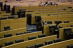 The upper house is called the Senate of Thailand. The chamber is non-partisan and has limited legislative powers. The Senate is composed of 250 appointed members appointed by the Royal Thai Army.[2] A term in the Senate is six years. It forbids members from holding any additional office or membership in political parties.[3]