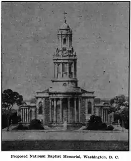 A movement for the creation of a national Baptist memorial in Washington, D.C. began in 1917.[13] The original concept was as a memorial to Roger Williams and religious freedom. The design was to included a prominently placed statue of Williams (see illustration). In 1919 both the Northern and Southern Baptist Conventions agreed to add $175,000 each for the memorial in their five-year plans. The Washington area was to contribute another $100,000, with Immanuel Baptist Church pledging to raise $50,000 of the Washington contribution from within the church.[14]