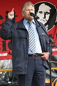 The party is a neo-Nazi organization[8][21][22][23][24] and has been referred to as "the most significant neo-Nazi party to emerge after 1945".[25] The German Federal Agency for Civic Education, or BPB, has criticized the NPD for working with members of organizations which were later found unconstitutional by the federal courts and disbanded,[26][27] while the Federal Office for the Protection of the Constitution (German: Bundesamt für Verfassungsschutz), Germany's domestic security agency, classifies the NPD as a "threat to the constitutional order" because of its platform and ideology, and it is under their observation.[28] An effort to outlaw the party failed in 2003, because the government had many informers and agents in the party, some in high position, who had written part of the material used against them.[29] Since its founding in 1964, the NPD has never managed to win enough votes on the federal level to cross Germany's 5% minimum threshold for representation in the Bundestag; it has succeeded in crossing the 5% threshold and gaining representation in state parliaments 11 times, including one-convocation entry to seven West German state parliaments between November 1966 and April 1968 and two-convocation electoral success in two East German states of Saxony and Mecklenburg-Vorpommern between 2004 and 2011.[30] Since 2016, the NPD has not been represented in state parliaments. Udo Voigt led the NPD from 1996 to 2011.[28] He was succeeded by Holger Apfel,[31] who in turn was replaced by Udo Pastörs in December 2013. In November 2014, Pastörs was ousted and Frank Franz became the party's leader. Voigt was elected the party's first Member of the European Parliament in 2014. The party lost the seat in the 2019 European Parliament election.