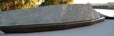 The overall memorial was designed by Aspect Melbourne Pty Ltd.[1] The frieze bas relief was created by artist Charles Anderson. The outdoor sculpture was created by artist Darryl Cowie.