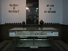 This library at the Gandhi Museum plays a dual role of showcasing Gandhi's work to the public and also serving as a place for general study. The books are divided into two sections, those written by or about Gandhi and books on other subject matters.[2] There are currently over 35,000 books or documents in the museum's library.[3] The library also has a collection of 2,000 periodicals in both English and Hindi chronicling the life of Gandhi.[4]