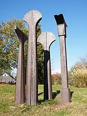 A small collection of public artwork, including Split Ritual by American sculptor Beverly Pepper, can be found at the Arboretum. The piece is made of ductile iron and stands at 10 ft (3.0 m) H x 44 in (110 cm) W x 100 in (250 cm) D. It consists of four vertical pieces that resemble large tools. They are placed in a circle on top of a flat, doughnut-shaped foundation. The sculpture was dedicated in 1993.