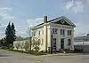 Most National Historic Sites are marked by a federal plaque bearing Canada's Coat of Arms.[44] In earlier years, these plaques were erected on purpose-built cairns,[10] and in later years have been attached to buildings or free-standing posts. These maroon and gold markers are typically in English and French, though some are trilingual where another language is relevant to the subject being commemorated.[45]