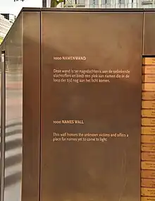The National Holocaust Names Memorial (Amsterdam) (Dutch: Holocaust Namenmonument) is since 2021 the Dutch national memorial for the Holocaust and the Porajmos at Amsterdam. It commemorates the approximately 102,000 Jewish victims from the Netherlands who were arrested by the Nazi regime during the German occupation of the country (1940-1945), deported and mostly murdered in the Auschwitz and Sobibor death camps, as well as 220 Roma and Sinti victims.