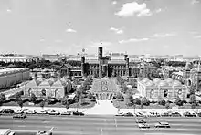 The African art and Sackler buildings were built as twin pavilions, each one story above ground and with similar display space: five galleries each, and only one with natural light. They are differentiated by their roof adornments: domes on the African art building and pyramids on the Sackler.[6] The African art pavilion was built in red granite and used the circle shape as its architectural theme, with round windows, a rounded entrance staircase, and six round domes on its roof. Inside, a limestone foyer overlooks the gardens. A curving stair hall leads visitors down curving stairs to the galleries. The galleries are large and customized by exhibition designers into smaller rooms to better suit small objects.[25] The buildings are visible from Independence Avenue,[6] and the new Enid A. Haupt Garden runs between them and the Smithsonian Institution Building.[25] Underground, the museum and offices occupy the first two levels. A third level hosts exhibition and educational rooms. Its levels are connected by a three-story[25] enclosed arcade with large skylights set into the gardens above, through several feet of dirt.[6] The pavilion was renovated in the early 2000s with a significant donation from Eastman Kodak.[10]