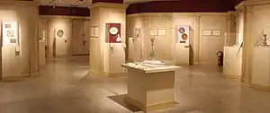 When one of the major sites of the Harappan civilization, Mohenjo Daro, was excavated in the 1920s, archaeologists deposited its important finds first in the Lahore Museum, and then these were moved to Delhi by Mortimer Wheeler in anticipation of the construction of a Central Imperial Museum there. At the time of the Partition, the issue of ownership of these objects arose and eventually the two countries agreed to share all the collections equally, although this was sometimes interpreted in literal sense, with several necklaces and girdles taken apart with half the beads sent to Pakistan and half retained in India.[6] In the words of Nayanjot Lahiri, ‘the integrity of these objects were compromised in the name of equitable division’.[23] Of the two most celebrated sculpted figures found in Mohenjo Daro, Pakistan asked for and received the steatite figure of a bearded male, dubbed the 'Priest King', while the National Museum of India retained the bronze statuette of the 'Dancing Girl', a nude bejeweled female.[6] Considering that the major sites like Mohenjo Daro and Harappa belonged to Pakistan post-Partition, the collections in this gallery also grew out of the discoveries of the excavations made after the Indian independence in 1947 such as Daimabad, Rakhigarhi, and Dholavira.
