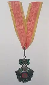 Both the badge and the star had the same design, as shown in the top right of this page. The ribbon was red with yellow borders. It was, in fact, the ribbon of the former Order of the Dragon of Annam when awarded by the Emperor of Annam himself (when awarded by the French Government the ribbon was green with orange borders).