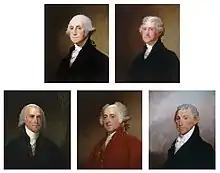 Even as the Stuarts controversy occupied the attention of the press, the National Portrait Gallery continued to expand its collection. In April 1979, it obtained five other portraits by Gilbert Stuart. These five paintings — of presidents George Washington, Thomas Jefferson, James Monroe, John Adams, and James Madison — were known as the Gibbs-Coolidge set. The portraits were donated by the Coolidge family of Boston (without controversy).[24] In December, the museum obtained a bust of Alexander Hamilton by John Trumbull (which may have been sculpted from the portrait which was later used for the $10 bill) and a Gilbert Stuart portrait of Representative Fisher Ames from the Henry Cabot Lodge family in Massachusetts.[25] The following April, Varina Webb Stewart and Joel A.H. Webb presented important portraits of Jefferson Davis and his wife, Varina Howell Davis, to the National Portrait Gallery. (Stewart and Webb were the Davis' great-grandchildren.)[3] In 1980, the museum obtained (through purchase and loan) a number of works by graphic artist Howard Chandler Christy for exhibit. Works displayed ranged from his "Christy girl" recruiting posters to history-based works such as Scene at the Signing of the Constitution of the United States.[26]