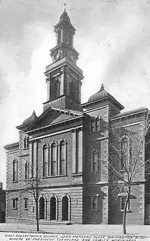 Officially organized on October 13, 1885, with 53 charter members, this congregation acquired a strategic site at the intersection of N and 18th Streets and Connecticut Avenue NW, the heart of a fast-growing and affluent residential area. On June 28, 1887, the cornerstone of the greystone Romanesque Revival church was laid.[22] The first service was held there on September 25, 1889. It was dedicated January 6, 1901, after the construction debt was paid. President Benjamin Harrison and inventor Alexander Graham Bell were among the new congregation’s worshipers.[23][24]