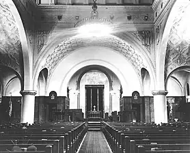 The main six divisions of the Hopkins Organ are located behind the choir at the front of the sanctuary with the pipework shielded from view behind a series of vertical screens. At the rear of the sanctuary, a 23-rank antiphonal division is located in the gallery balcony. It includes a brilliant state trumpet, which is mounted horizontally. The organ's inaugural concert was performed in April 1970 with Ernest Ligon at the manuals.[9][10]