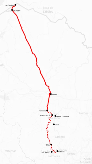In Alajuela province the route covers San Carlos canton (Florencia, Cutris, Pocosol districts), Los Chiles canton (Los Chiles, El Amparo, San Jorge districts).