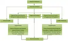 The organogram of the service has the Board of the service at the top. The Board supervises the activities of the Executive Director and two Deputy Executive Directors. One deputy is the Head of Finance and Administration and the other is in charge of the service's operations. The Executive Director and the Deputies supervise the activities of the Heads of various Departments.[2] At the regional level, the service is headed by the Regional Director who in turn supervises the work of the various District Directors. The service has Regional Heads in all the ten regional capitals of the country. The service has a staff strength of 342.[2]
