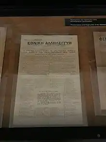 The decision to establish a resistance organization was taken by Pantelis Karagitsis, Lefteris Apostolou and Aristotelis Bouras, who had just escaped from the internal exile imposed by the pre-war Metaxas Regime. National Solidarity was thus founded on 28 May 1941, barely a month into the Occupation, in a park behind the Soteria hospital. It was the first nationwide resistance group established in Greece.[1] Its founding members were: Kleon Papaloizos, who was also elected its secretary, Vasileios Markezinis, Dionysia Papadomichelaki, Nikos Dresios, Georgios Vasilopoulos and Spyros Antypas.