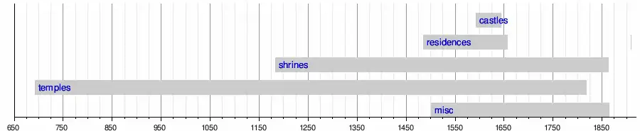 By 1929, about 1,100 properties had been designated under the 1897 "Ancient Shrines and Temples Preservation Law."[2] Most were religious buildings dating from the 7th to early 17th century. Approximately 500 buildings were extensively restored, with 90% of the funding provided by the national budget. Restorations during the Meiji period often employed new materials and techniques.[4]