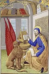 - Emblem: Since its foundation until 1574, the first official shield showed an image of the Virgen del Rosario, considered the patron saint of the Dominican friars; on the right, a representation of the Pacific Ocean and below a lime —fruit, referring to the city of Lima—. The coat of arms was approved by King Carlos I of Spain in 1551. By the end of 1570, after the papal bull of Pius V, the coat of arms was modified, replacing the image of the Virgen del Rosario with that of the new patron of the university, the apostle Saint Mark and the Lion. The colors that were used in that coat of arms are ignored since the documents in the century were only black and white. It was not until 1929 that the colors: blue for the ocean, black or brown for the image of the saint, light blue for the background, and silver for the columns, became widespread. The second original shield with the image of San Marcos has been the longest-lasting symbol of the university: it was used for almost four hundred years. In 1929 the original colors mentioned in the ancient texts were officially introduced: blue for the ocean, black or brown for the image of the saint, light blue for the background, and silver for the columns, etc. This last update of the shield is the one that is used today, following a tradition that dates back to the middle of the century. Below is the original description given on the shield by the Constitution of the University of San Marcos of 1578:[127]