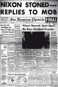 From the colonial era, through independence and the republic until 1946, the university was referred to both colloquially and formally —in various treaties and historical documents— as "University of Lima";[77] that year its name was made official as the Universidad Nacional Mayor de San Marcos, a name that remains to this day. Between the 1950s and 1960s, the influx of more middle-class students at the University of San Marcos led the government to emphasize and create scientific and university research areas. In 1951, as a commemoration of the 400th anniversary of the founding of the University of San Marcos, the university acquires a new piece of land to build the new University City, where the Stadium of the University of San Marcos was inaugurated that same year. On the occasion of the quadricentennial, a ceremony was also held that brought together the rectors of the main Ibero-American universities, who decided to give her the title and recognition of "Dean of America". Due to this —and also given its primacy in the country— the university has since retained the names of the University of Peru and the Dean of the Americas.[6] In 1958, a significant incident occurs during the visit of then Vice President Richard Nixon,[87][88][89] who would later become the 37th president of the United States and also the first president to resign after the Watergate scandal. Nixon had scheduled a conference at the University of San Marcos as part of his visit to Latin America, however, this did not take place due to the protest of San Marcos, who spoke out against US policy in the region with phrases such as: Nixon, Go Home!.[90][91][92] Given the incident, the conference was transferred to the Catholic University of Lima, where Nixon had a particularly bad reception.[88]