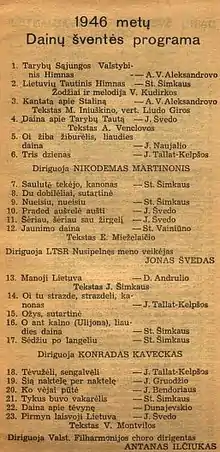 The committee consisted of K. Preikšas as the chairman, Justas Paleckis, Juozas Banaitis, Juozas Žiugžda, and the honored artists in the Lithuanian SSR, Professor Juozas Gruodis, Kostas Korsakas, and Vladas Niunka. The lyrics and the melody of the national anthem of the Lithuanian SSR should be submitted no later than on 1 January 1946. However, the anthem wasn't submitted in the deadline. A new commission for the anthem was created, consisted of Antanas Venclova, Theophilus Tilvytis, Juozas Melnikas, Valerija Valsiūnienė, Eduardas Mieželaitis, Vacys Reimeris and Aleksys Churginas. Due to the active partisan struggle in Lithuania, the plans of the new national anthem was relinquished. Apparently, the authorities believed that replacing Tautiška giesmė with a new one would further aggravate dissatisfaction of the population with the political system.[12]