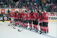 The Canadian national colours and the de facto third colour, black, are used prominently by ice hockey teams representing the nation, including the men's ice hockey team, men's junior ice hockey team, men's under-18 ice hockey team, men's ice sledge hockey team, men's inline hockey team, women's ice hockey team, and women's under-18 ice hockey team. The logo of Hockey Canada, the national governing body for ice hockey in Canada, is red, white, and black; though, their specifications are different from those of the national colours.[19]