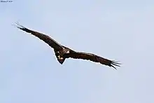 The golden eagle (Aquila chrysaetos) is one of best known birds of prey and most widely distributed species of eagle. It is dark brown, with lighter golden-brown plumage on its nape. | |