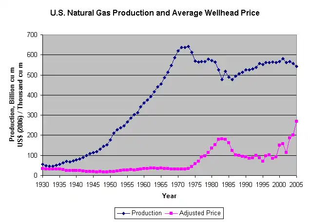 The chart shows a 75-year history of annual United States natural gas production and average wellhead prices from 1930 through 2005. Prices paid by consumers were increased above those levels by processing and distribution costs. Production is shown in billions of cubic meters per year, and average wellhead pricing is shown in United States dollars per thousand cubic meters, adjusted to spring, 2006, by the U.S. Consumer Price Index.[15][16][17][18][19]