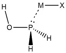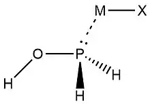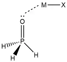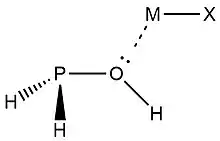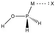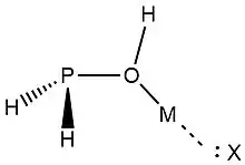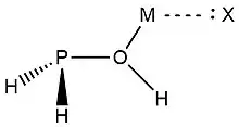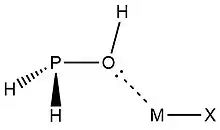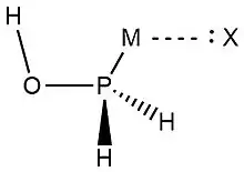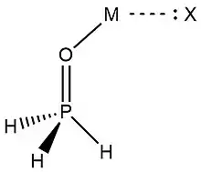 Zheng et al., also analyzed MX interactions with trans- and cis-phosphinuous acid to compare the electron donating abilities of phosphorus and oxygen atoms. The results above demonstrate that when phosphorus acts as the electron donor the weights of ωI and ωII are similar.[9] This is indicative of 3-center 4-electron bonding models. Despite greater mixing, ωII is determined to be the best natural Lewis structure for the both the trans- and cis- complexes, with CuBr and AgBr as the only exceptions. Researchers explain that this result is consistent with analyses showing the preference for phosphorus to form covalent interactions. Overall, "the degree of covalency for P–M bonds decreases in the order of F> Cl > Br, Au > Cu > Ag, while the degree of noncovalent for O–M bonds, there is an increase according to F < Cl < Br, Au < Cu < Ag in the entire family."[9]