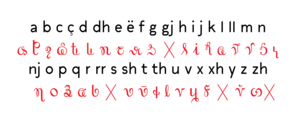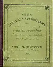 In 1824 or 1825[8] he started the creation of his alphabet of the Albanian language.[12] The final version of his thirty-three-letter Vithkuqi alphabet, whose characters were invented by Veqilharxhi, was printed as part of primer in 1844-5 titled Evëtori Shqip Fort i Shkurtër (English: The most Useful and Concise Albanian Alphabet).[13][12][2] Veqilharxhi avoided the use of Latin, Greek or Arabic alphabets and characters because of their religious associations and the possibility of causing divisions among Albanians of different religions.[14][12] Veqilarxhi's Evëtor first distributed in Korçë and later westwards as far as Berat, where it reached great success.[15][12][2] It was also circulated in Përmet.[16] On April 22, 1845 Athanas Paskali, one of the notable people of Korçë, along with others sent him a letter requesting as many more copies as possible.[15] Among Albanian historians this publication by Veqilharxhi is considered as the beginning of the Albanian national awakening.[2]